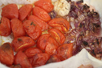 השנה, מכיוון שהתנור כבר היה דלוק, ערמתי בתבנית בצל, ראש שום וקילו עגבניות, וצליתי אותם יחד כארבעים דקות בחום בינוני.